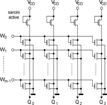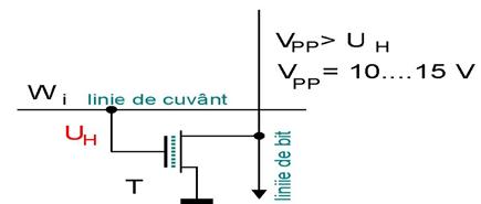 Tranzistorul MOS cu grila flotanta din figura 9 are Up2 > Ud. La activarea liniei de cuvant Wi(Wi= 1), T nu va conduce, iar linia de bit corespunzatoare va fi in 1 logic datorita sarcinii active formate din alt tranzistor MOS, asa cum se poate observa in figura