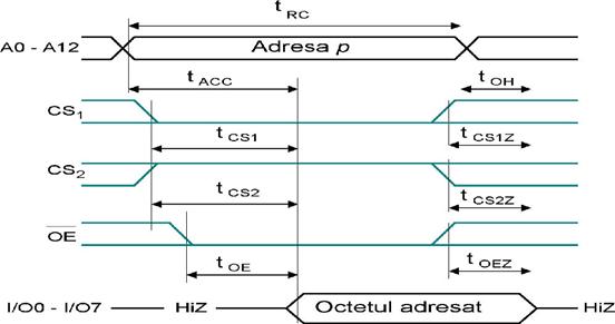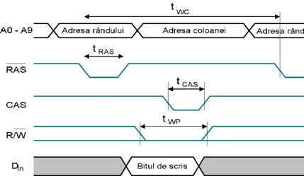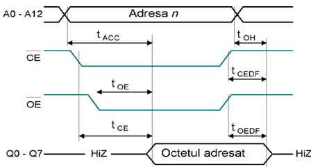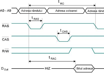 Se aplica A0.A9 si se activeaza linia /RAS pentru incarcarea adresei liniei de cuvant in latch-ul din circuitul de comanda, fapt ce duce la selectia unei linii de cuvant si se scrie continutul celulelor de pe linia de cuvant in registrul RLB. Apoi intr-o alta secventa se aplica la intrare A10.A19. Semnalul /WE trebuie sa fie pe 1 (se executa o operatie de citire). Dupa aplicarea celei de-a doua jumatati a adresei se aplica semnalul /CAS activ pe "0". Pe frontul scazator al semnalului /CAS se memoreaza A10.A19 in latch-ul de 10 biti din circuitul de comanda. Se aplica acesti 10 biti MUX-ului, se selecteaza una dintre cele 1024 de iesiri ale registrului RLB si se transmite la bufferul B inspre iesire Dout. Simultan bufferul B este trecut in stare normala.