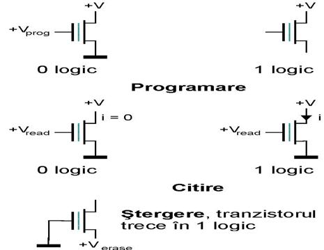 Schema simplificata a unei memorii EPROM la care partea de programare a fost omisa este prezentata in figura Cele 4 tranzistoare MOS din partea superioara a schemei formeaza sarcinile active pentru tranzistoarele utilizate in nodurile matricii de memorare. S-a ales aceasta varianta in locul unor rezistente de sarcina deoarece un tranzistor MOS ocupa un spatiu mai redus in aria de siliciu, iar consumul de putere este mai mic. Daca tranzistoarele matricei de memorare ar fi tranzistoare MOS obisnuite, la activarea liniei de cuvant Wi, toate iesirile ar fi puse la masa puse la masa (0000). Pentru a trece una din liniile de bit pe 1 ar fi necesar ca tranzistorul din nodul ce corespunde liniei Wi sa nu conduca atunci cand Wi = 1, iar programarea ar trebui realizata fara intreruperea legaturii fizice a grilei la linia de cuvant. Pentru aceasta este necesara folosirea unui nou tip de tranzistor MOS, si anume tranzistorul MOS cu grila flotanta, dezvoltare tehnologica care a permis realizarea memoriei EPROM. Caracteristica iD-Ugs a unui astfel de tranzistor MOS (figura 8) depinde de incarcarea cu sarcini negative a grilei flotante. Tranzistoarele din nodurile corespunzatoare unei linii de bit care trebuie sa fie pe 1 trebuie sa aiba poarta flotanta incarcata cu sarcina negativa q-. Programarea este facuta prin incarcarea grilei flotante cu ajutorul unui impuls de programare (10V-15V, tipic 12 V sau uneori 12,5 V) intre drena si sursa tranzistorului, cu durata de cateva zeci de ms, dupa selectarea liniei de cuvant Wi= UH (figura 9).