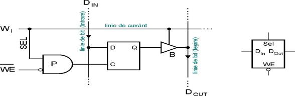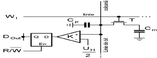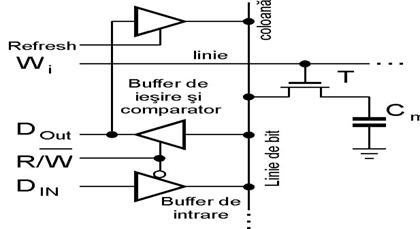 Bufferul B deserveste toate celulele conectate la linia de bit LB, din care s-a prevazut o singura celula. Cu ajutorul lui B se alimenteaza in impuls linia de bit. Fiecare linie de bit este prevazuta cu comparatorul K si bistabilul D-latch ce servesc la citirea informatiei. Linia de cuvant este activa pe 1 actionata in impulsuri. Celula de memorare propriu-zisa se compune din tranzistorul de comutatie T si capacitatea integrata de memorare de valoare foarte mica Cm