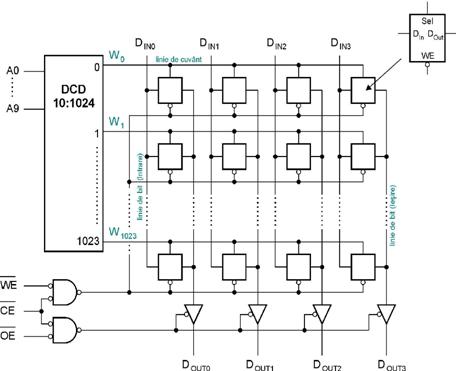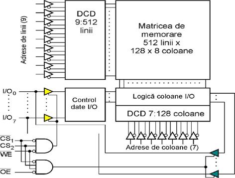 Pentru exemplificare, in figura 37 este prezentata schema bloc a unei memorii DRAM de 1024kbiti organizata pe cuvinte de cate 1 bit, a caror selectie se realizeaza prin coincidenta.