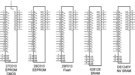 Exista si pentru celelalte memorii o compatibilitate a pinilor. Pentru familia de memorii de 1 Mbit organizate ca 128 kcuvinte de 8 biti, dispunerea terminalelor pentru cele mai reprezentative circuite este prezentata in figura 28. Memoria SRAM 628128 este un alt exemplu de memorie SRAM de 1 Mbit, avand structura reprezentata simplificat in figura 29.