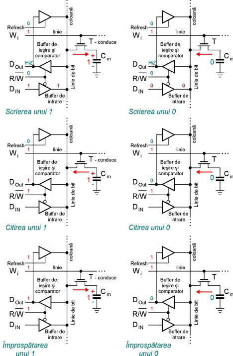 Comparatorului K va avea iesirea pe 0 care este memorat de bistabilul D-latch. Dupa fiecare operatie de citire, care altereaza nivelul de tensiune de la bornele Cm se efectueaza o operatie de reanscriere a bitului citit folosind iesirea bistabilului D-latch (reimprospatarea informatiei alterate prin citire). Nu numai prin citire are loc o alterare a informatiei inscrise in Cm ci si datorita descarcarii exponentiale in timp a acesteia datorita curentilor de pierdere. Din acest motiv, chiar daca nu se efectueaza citiri, este necesara reimprospatarea sarcinii acumulate in Cm la fiecare 2-4ms (depinde de tipul memoriei).