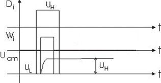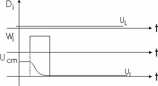 Inscrierea unui 1 in celula se face punand linia de bit LB la UH prin activarea bufferului B. In acest timp se aplica un impuls de inaltime tot UH liniei de cuvant Wi = 1 care determina intrarea in conductie a tranzistorului T si incarcarea lui Cm la UH