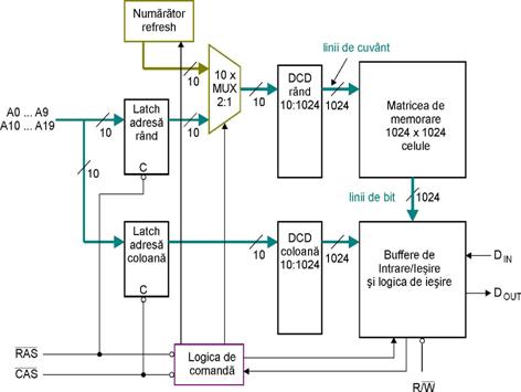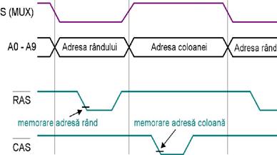 Intai se aplica prima jumatate a cuvantului de adresa A0.A9, apoi a doua jumatate A10.A19. Circuitul de comanda contine doua lacth-uri D de memorare a celor doua jumatati ale cuvantului de adresa. Prin intermediul liniilor A0.A9 se comanda decodificatorul care are rolul de a selecta o singura linie de cuvant. Incarcarea A0.A9 in registrul din circuitul de comanda se face prin activarea liniei /RAS. Cu liniile A10.A19 se comanda blocul MUX/DMUX prin care se selecteaza o singura linie de bit (la citire prin MUX, iar la inscriere prin DMUX). Incarcarea adreselor A10.A19 in registrul corespunzator din circuitul de comanda se face prin activare liniei /CAS (Column Address Strobe). Linia de control stabileste care dintre cele doua circuite (MUX sau DMUX) este activ. Evident la citire este activ MUX-ul, iar la scriere DMUX-ul.