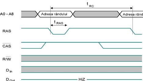 Pe frontal scazator al semnalului /RAS se inregistreaza adresa liniei de cuvant in registrul din circuitul de comanda. Se selecteaza o linie de cuvant ce corespunde acestei adrese si se inscrie continutul fiecarei celule ce corespunde lui LC selectat in RLB. Pe frontul crescator al semnalului /RAS se reanscrie informatia din registru regenerata in celulele apartinatoare liniei de cuvant selectata. In continuare se trece la urmatoarea linie de cuvant in vederea improspatarii tuturor celulelor. Generarea adreselor pentru improspatarea memoriei se face folosind un numarator pe 8 biti ce functioneaza continuu. Se constata ca nu intervine adresa ce stabileste linia de bit in care se face inscrierea sau citirea.