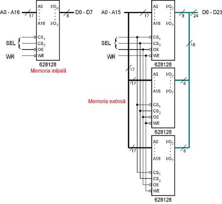 Acesta este cel mai simplu caz - deoarece numarul de cuvinte memorate este suficient pentru aplicatia concreta. In exemplul urmator, presupunem ca se doreste modernizarea memorie operative a unui sistem de achizitie video prin trecerea de la imagini alb-negru in 256 de nuante de gri (codificate pe 8 biti) la imagini color codificate pe 24 de biti (16.77216 culori). Imaginea are o rezolutie de 320 x 240 de puncte (76.800 puncte), se achizitioneaza si prelucreaza o singura imagine si de aceea o memorie de 128 kbit x 8 era suficienta pentru cazul alb-negru. In acest exemplu determinarea numarului de circuite necesare este banal, fiind evident necesare 3 asemenea circuite (figura 41). Memoria initiala folosea un singur circuit, cea modernizata utilizeaza trei asemenea circuite. Conectarea se face legand in paralel linie cu linie toate intrarile celor trei memorii (adresele A0-A15, liniile de sectie SEL si linia de comanda a scrierii nWR). Liniile de iesire sunt separate si formeaza noua magistrala de 24 de biti.
