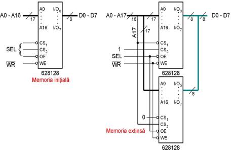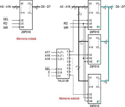 Exista situatii in care se doreste o extindere substantiala, de exemplu atunci cand se doreste realizarea unei memorii Flash de 1 Moctet utilizand 8 circuite 29F010 de 128 kocteti. In acest caz prezenta unui decodificator 3:8 este indispensabila. Pentru a dresa 1 Moctet sunt necesare 20 de linii de adresa, 17 mai putin semnificative fiind legate in paralel la cele 8 memorii Flash notate #0#7, cel 3 mai semnificative A17-A19 fiind intrari in DCD 3:8 74LS138. In acest caz memoria extinsa are aceleasi linii de control ca memoria initiala (nSEL, nOE, nWR, nRD) nemaifiind necesare alte modificari. Pentru schema electrica extinsa trebuie facute cateva comentarii: