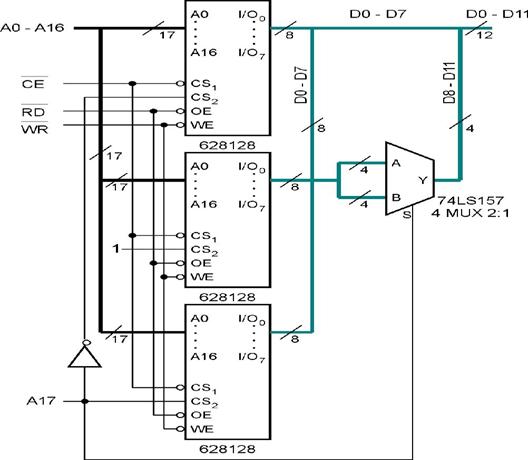 In ambele cazuri sunt necesare 3 circuite de memorie, iar al doilea caz este chiar simplu. Pentru primul caz se vor utiliza alternativ 128 kcuvinte de 8 biti din primul si 128 kcuvinte de 4 biti din al doilea circuit, respectiv 128 kcuvinte de 8 biti din al treilea circuit impreuna cu celelalte 128 kcuvinte de 4 biti din al doilea circuit. Cu alte cuvinte, al doilea circuit de memorie este divizat logic in doua jumatati, asociate celorlalte doua circuite (figura 44). Pentru a selecta care jumatate este utilizata, la iesirea memoriei #2 se foloseste un multiplexor cvadruplu 2:1, de tip 74LS15
