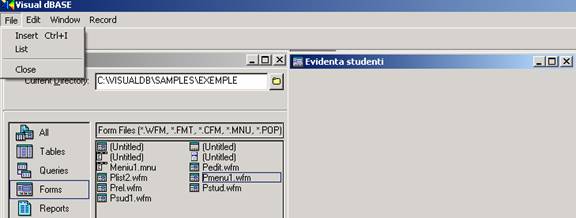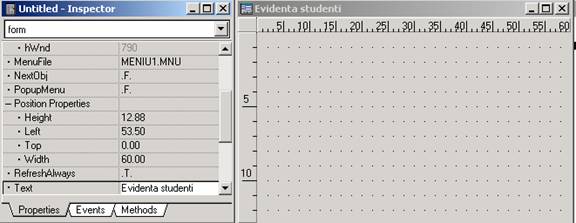 Se deschide cu Designer un Form cu titlul Evidenta studenti si numele Pmenu1 la care se ataseaza prin proprietatea MenuFile meniul proiectat anterior Meniu1.mnu.