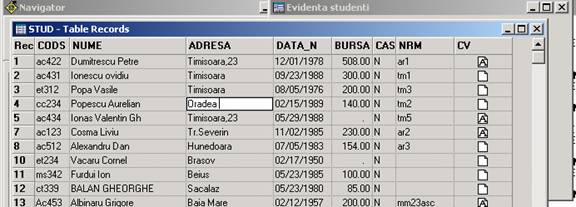 Daca selectam List se va afisa continutul fisierului Stud (Browse) Câmpul memo CV poate fi afisat si modificat prin DblClick care va deschide o fereastra Editor.