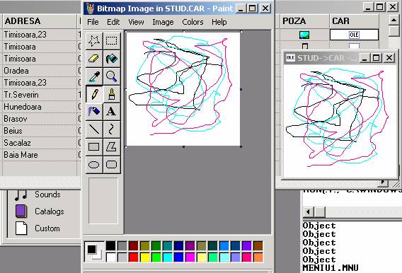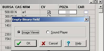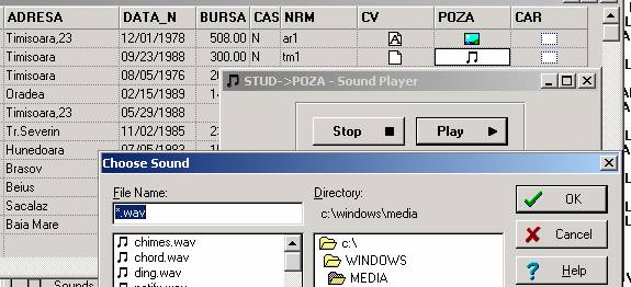 Se observa ca am introdus sunete în câmpul poza, fiindca în ambele cazuri tipul câmpului este BIN. Acestui câmp i se asociaza un fisier care poate fi de imagini sau sunete.Redarea sunetului atasat câmpului se face prin DblClick pe câmp si PLAY.