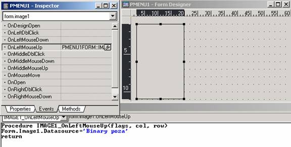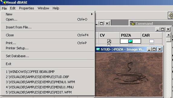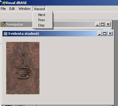 Pentru programul de meniuri Pmenu1 proiectat anterior vom plasa pe FORM un obiect IMAGE. O sa-i atasam un câmp poza din fisierul STUD pe evenimentul OnClick pe obiectul Image.