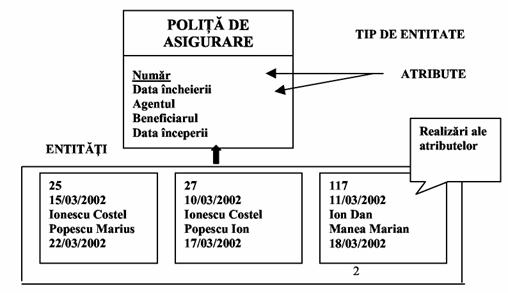 Entitatea polita de asigurare nr. 25 se defineste prin urmatoarele realizari ale caracteristicilor: 15/03/2002 (data incheierii), Ionescu Costel (numele agentului de asigurare), Popescu Marius (titularul politei de asigurare), 22/03/2002 (data inceperii perioadei asigurate), etc. Entitatea polita de asigurare nr. 25 are propria identitate, distingandu-se clar de celelalte entitati de acelasi tip (celelalte polite incheiate) prin numarul sau si are o existenta de sine statatoare (Figura 2.2).