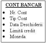 Exemplu. Pentru conturile deschise de o banca se poate defini in cadrul modelului conceptual al datelor tipul de entitate cont bancar (Figura 2.4).