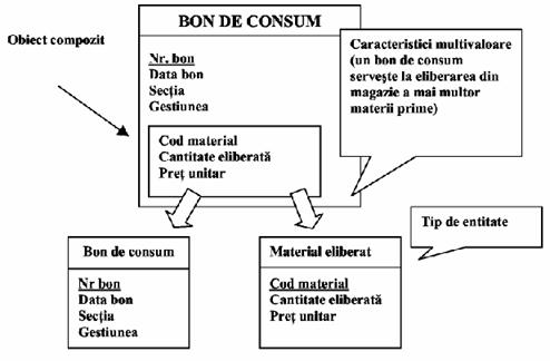 Exemplu. Documentelor bonuri de consum le va corespunde tipul de entitate bon de consum definit prin atributele monovaloare: numar bon, data bon, sectia, gestiunea dar si atributele multivaloare: cod material, cantitate eliberata, pret unitar. Aceasta face ca tipul de entitate bon de consum, definit initial prin multimea tuturor atributelor mai sus mentionate, sa conduca in final la definirea a doua tipuri de entitati: Bon de consum (documentul in sine) definit prin atributele: numar bon, data bon, sectia, gestiunea si tipul de entitate Material eliberat definit prin atributele: cod material, cantitate eliberata, pret unitar (Figura 2.5).