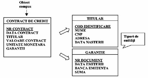 Exemplu. Tipul de entitate contract de credit - definit prin atributele: numar contract, data contract, titular, valoare contract, unitate monetara, garantii - corespunde unui obiect compus al realitatii de modelat. Titularul si garantia sunt doua obiecte distincte ale problemei de modelat, fiecaruia trebuind sa-i corespunda in MCD un tip de entitate distinct. Ca urmare, se vor include in MCD tipurile de entitati: