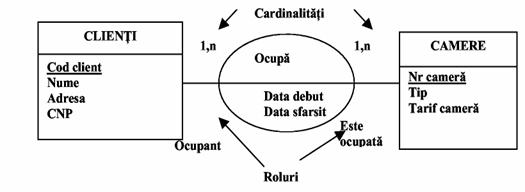 Exemplu. Atributele Data debut si Data sfarsit caracterizeaza asocierea Ocupa si aceasta deoarece ele nu sunt proprietati ale entitatii Camere - aceiasi camera cu nr. 10 poate fi ocupata la date diferite de catre clienti diferiti. Fiecare entitate participanta la asociere joaca un anumit rol. In exemplul prezentat in figura II.8 entitatea Client joaca rolul ocupant (clientul x ocupa in data y camera z) iar entitatea Camera prezinta rolul este ocupata (camera z este ocupata in data y de clientul x).