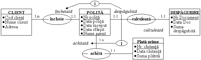 Pentru exemplificare va propunem ca domeniu de studiu gestiunea politelor incheiate de o societate de asigurari. Entitatile pe care le putem defini sunt: o polita de asigurare, instrumente de plata, etc.