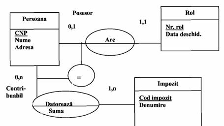 Exemplu. Orice contribuabil aflat in evidenta administratiei financiare are deschis un rol fiscal si numai unul singur (in acest caz atat ccardinalitatea minimala cat si cea maximala sunt 1).
