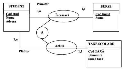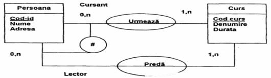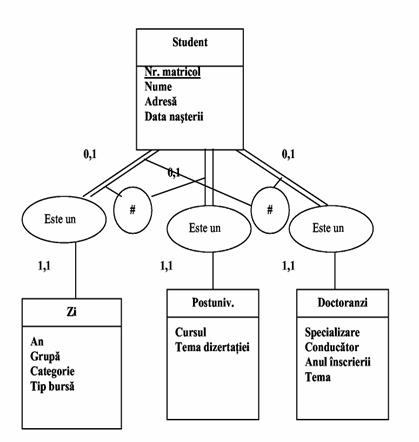 Figura 2.42 evidentiaza faptul ca orice entitate apartinand tipului student isi gaseste corespondent intr-o realizare a unui subtip. S-a marcat distinct si de aceasta data restrictia de integritate de excluziune dintre subtipurile de entitati (daca este un student la zi nu poate fi student la un curs postuniversitar sau doctorand). Exista situatii in care intre cele doua subtipuri de entitati avand acelasi supertip pot aparea si restrictii de incluziune, deci realizarile cele doua subtipuri nu sunt disjuncte (figura 2.43).