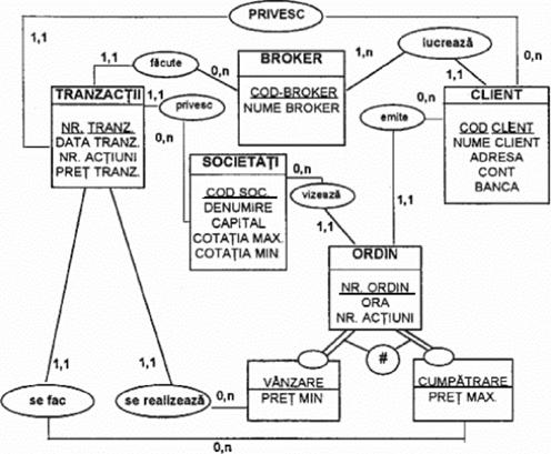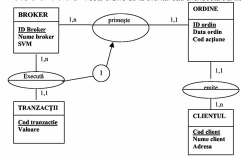 Ordin definit prin: Nr-ordin (identificator), data ordin, ora, nr-actiuni. Se remarca in cadrul MCD specializarea totala (cu specificarea restrictiei de excluziune intre entitatile subtipurilor) prin definirea subtipurilor Vanzare si Cumparare necesare retinerii pretului minim de vanzare respectiv pretului maxim de cumparare.