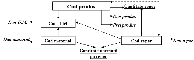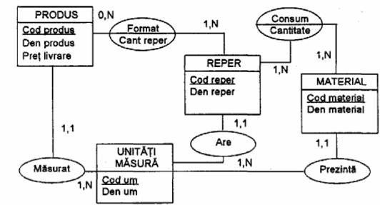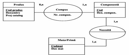 Sa presupunem ca dorim sa realizam un MCD care sa permita reprezentarea consumului specific de materii prime necesare fabricarii fiecarui subansamblu din componenta unui produs finit (Figura 2.45). Modelul conceptual din figura 2.45 este o reprezentare sincronica. Realitatea modelata nu a impus integrarea in MCD a elementului timp.