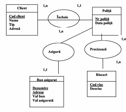 Sa luam cazul unei societati de asigurari si sa ne limitam la gestiunea doar a politelor de asigurare a bunurilor. In cadrul MCD trebuie sa cuprindem atat clientii societatii, bunurile pe care acestia le asigura si riscurile pentru care se face asigurarea.