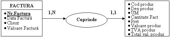 Din analiza MED prezentat in figura 2.50 constatam ca unele atribute isi gasesc corespondent direct in MCD, altele sunt atribute calculate (VAL-PRODUS, TVA-PRODUS, TOTAL-PRODUS) iar unele atribute, desi definesc aceleasi caracteristici, sunt definite cu nume diferite de cele utilizate in MCD (Client in loc de DEN CLIENT de exemplu), deci prin echivalenta isi gasesc un corespondent in MCD.