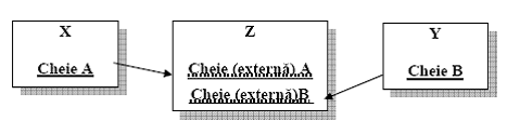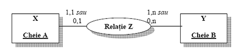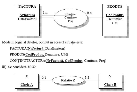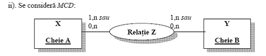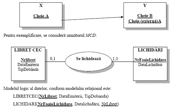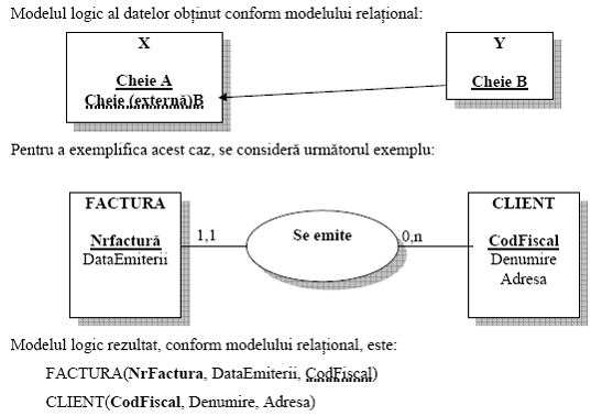 In acest caz particular al situatiei din cazul i), cheia entitatii, unde apare cardinalitatea 0,1 (in cazul de fata entitatea X), va trece si in componenta celeilalte, sub forma de cheie externa, pentru a asigura corelarea dintre cele doua.