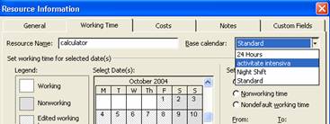 Daca mai multe resurse vor utiliza timpi de lucru diferiti de cei ai calendarului proiectului, dar aceiasi pentru toate resursele, este mai comod sa se defineasca un nou calendar (Tools Þ Change working time Þ New), dupa care acesta sa se aplice resurselor in cauza - vezi figura 3.1 (caseta de dialog Resource Information este reprezentata partial).