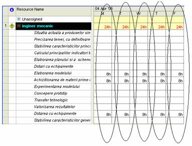 Dupa cum s-a putut vedea si in animatie, pentru fiecare resursa este posibila afisarea tuturor activitatilor in care ea este angrenata (vezi figura 3.3). In acest fel se poate vedea clar unde se produc suprapunerile (supra-alocarile). In figura 3.3, se vede cum ar putea arata pentru o resursa numita inginer mecanic, suprapuneri triple (activitatile Elaborarea modelului Achizitionarea de materii prime si Dotarea cu echipamente) - nu veti regasi in proiect aceasta situatie.