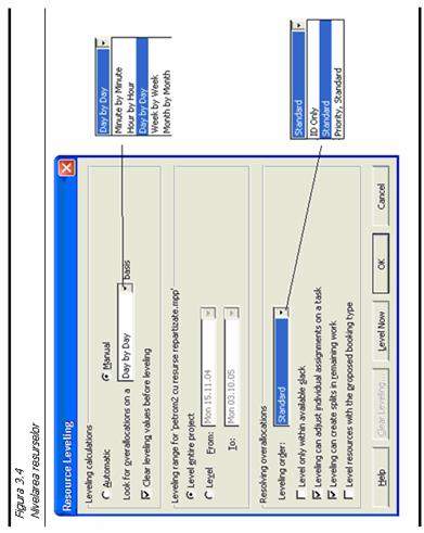 Figura 3.4 prezinta caseta de dialog Resources Leveling. Mai jos se vor da cateva detalii legate de anumite campuri ale acesteia.
