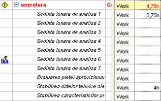 Nota: Se poate observa ca si dupa nivelare anumite activitati apar inca supra-alocate. In figura 3.5 se poate vedea cum resursa secretara apare ca supra-alocata desi timpul de lucru este de numai 4.75 ore (secretara are setat un nivel de disponibilitate de 75%, adica ar putea lucra 6 ore pe zi pentru proiect). Pentru activitatea Sedinta lunara de analiza, alocarea este de 100%, iar pentru Stabilirea datelor tehnice ale lucrarii de 50%. Microsoft Project va aduna cele doua nivele de alocare si astfel va ajunge la 150%, ceea ce reprezinta o supra-alocare (cel putin la nivelul procentelor de alocare). Microsoft Project rationeaza dupa urmatorul mecanism : "daca am alocat o resursa unei activitati la nivelul de 100%, chiar daca acea activitate dureaza numai 2 ore, cum nu s-a specificat nici un orar de desfasurare a acelei activitati, resursa trebuie sa fie disponibila 8 ore pe zi pentru acea activitate care s-ar putea desfasura oricand".