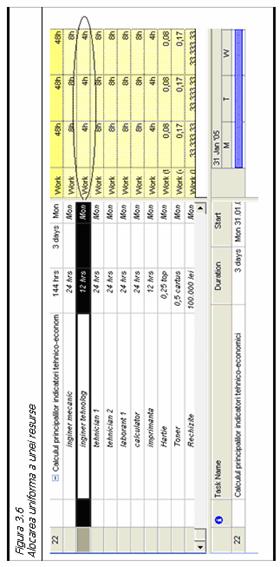 In figura 3.6 se va urmari situatia resursei inginer tehnolog. Aceasta este alocata uniform pe durata celor 3 zile, conform cu nivelul de alocare pentru aceasta activitate de 50%.