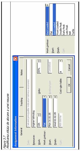 Pana acum toate resursele au fost aplicate uniform pe duratele lor de actiune. In figura 3.7, se poate vedea caseta de dialog Assignment Information Se va urmari campul Work contour S‑a lucrat pana acum numai in sistem Flat, adica repartizare uniforma a resursei pe durata activitatii. Exista insa si alte sisteme de repartizare a unei resurse (vezi tot figura 3.7).