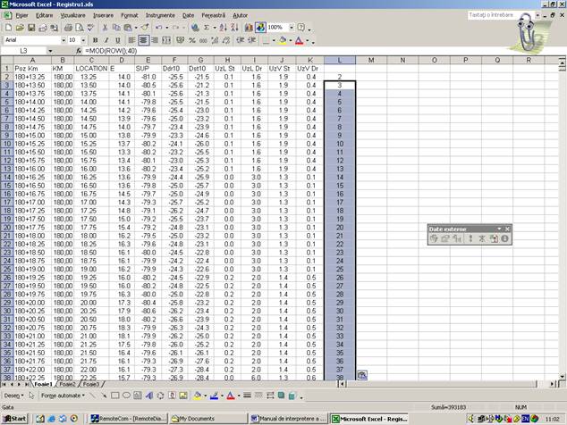 In cazul curbelor cu raza sub 250 m formula ciclica va fi =MOD(ROW();20) ceea ce inseamna faptul ca daca selectam tot a 20 a masuratoare se selecteaza valorile masurate din 5 in 5 m.