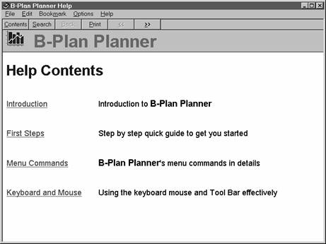 Daca ati mai lucrat cu help-ul Windows, sistemul help din B-Plan vi se va parea familiar. Selectati subiectele pentru care doriti explicatii si instructiuni. Puteti de asemenea defini semne de carte pentru regasirea rapida a informatiilor si puteti tipari continutul unui subiect.