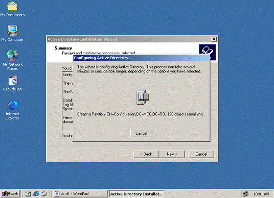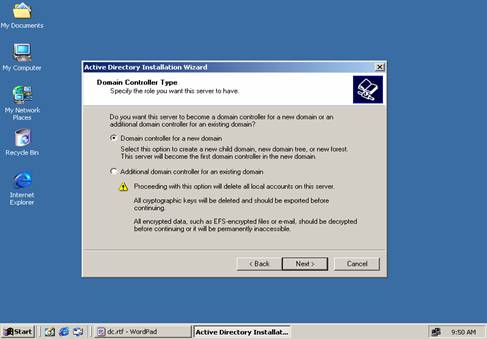 1) Start-Run-Dcpromo-Next-Se alege 'Domain Controller for the New Domain' sau 'Aditional Domain Controller for an Existing Domain' daca avem deja creeat Windows 2000 Domain.
