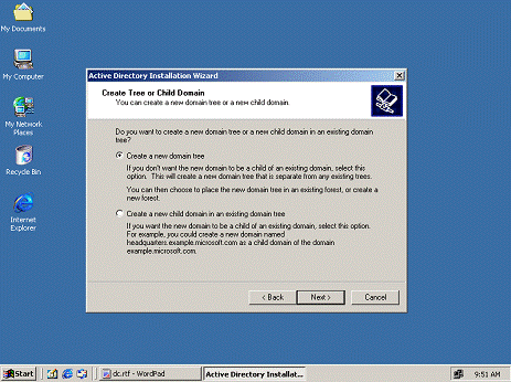 2)Se alege in continuare optiunea 'Create a new domain tree' sau daca exista deja unul creat 'Create a new child domain in an existing domain tree'.