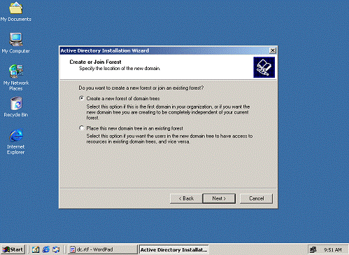 3)Avem posibilitatea de a creea un nou 'forest' sau de a alatura noul 'tree' intr-un forest deja existent.Alegem 'Creeate a new forest of doamin trees'.