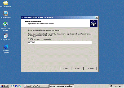 4)In continuare alegem Domain Name Server(DNS) pentru noul domeniul.Daca avem un 'DNS Name' inregistrat la un provider de Internet(ISP) il putem alege pe acela.Alegem ''MEC.RO".