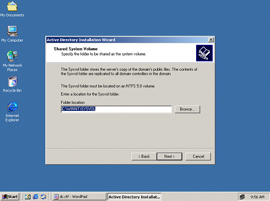 6)In continuare alegem locatiile default pentru baza de date si logurile Active Directory ca si locatia directorului 'SysVol' ,care se va replica pe toate DC's din domeniu.