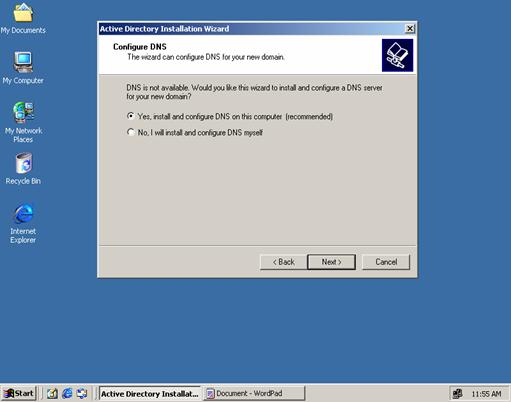 7)Avand in vedere ca serviciul de DNS nu s-a instalat inainde de promovare se alege optiunea: 'Yes,install and configure DNS on this computer (recommended)'.