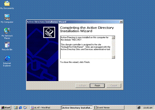 11)Dupa terminarea instalarii trebuie restartat server-ul si verificat dupa accea toate evenimentele ce au aparut in urma promovarii,din consola MMC 'Event Viewer',referitor la 'directory service','dns server','file replication services'.