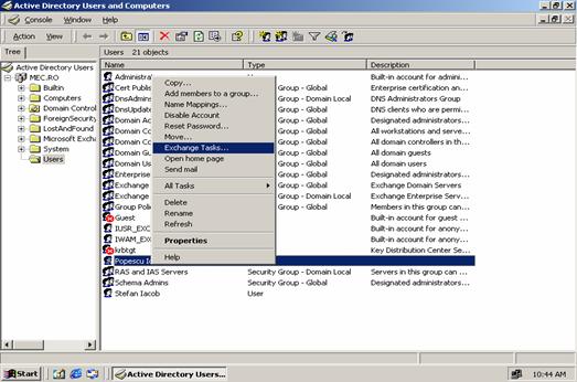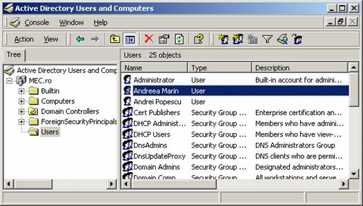Se lanseaza in executie programul < Active Directory Users and Computers > ca in figura de mai jos.