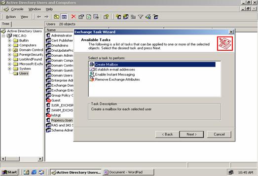 Apare fereastra care anunta crearea automata a clientului de Exchange prin bifarea optiunii < Create an Exchange mailbox >.