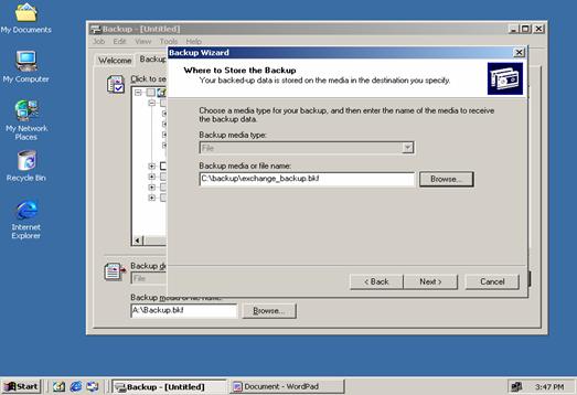 -Alegem 'Back up selected files,drives, or network data' si selectam, alaturi de 'System State' pentru restaurarea configuratiei serverului cu Exchange 2000,si 'Microsoft Information Store' din 'Microsoft Exchange Server' pentru restaurarea mailbox-urilor.
