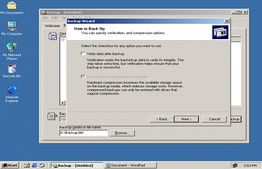 -inainte de final se alege optiunea 'Advanced' unde specificam tipul backup-ului(normal,incremental,diferential),verificarea datelor dupa salvare.