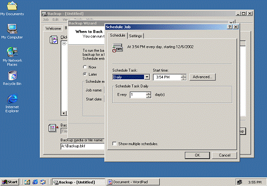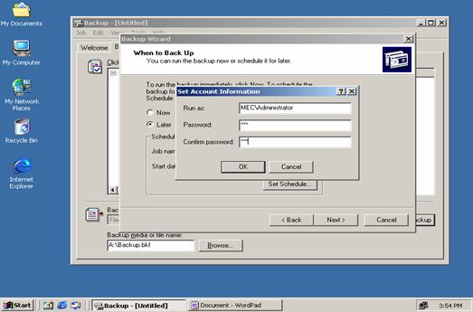 -daca avem unitate de banda se poate alege optiunea de adaugare a datelor sau de inlocuire a lor pe banda-Next-specificam descrierea salvarii si a benzii pe care se face salvarea-contul de user sub care ruleaza jobul de backup-se poate configura si repetarea jobului in zilele si la ore alese de noi-Finish.